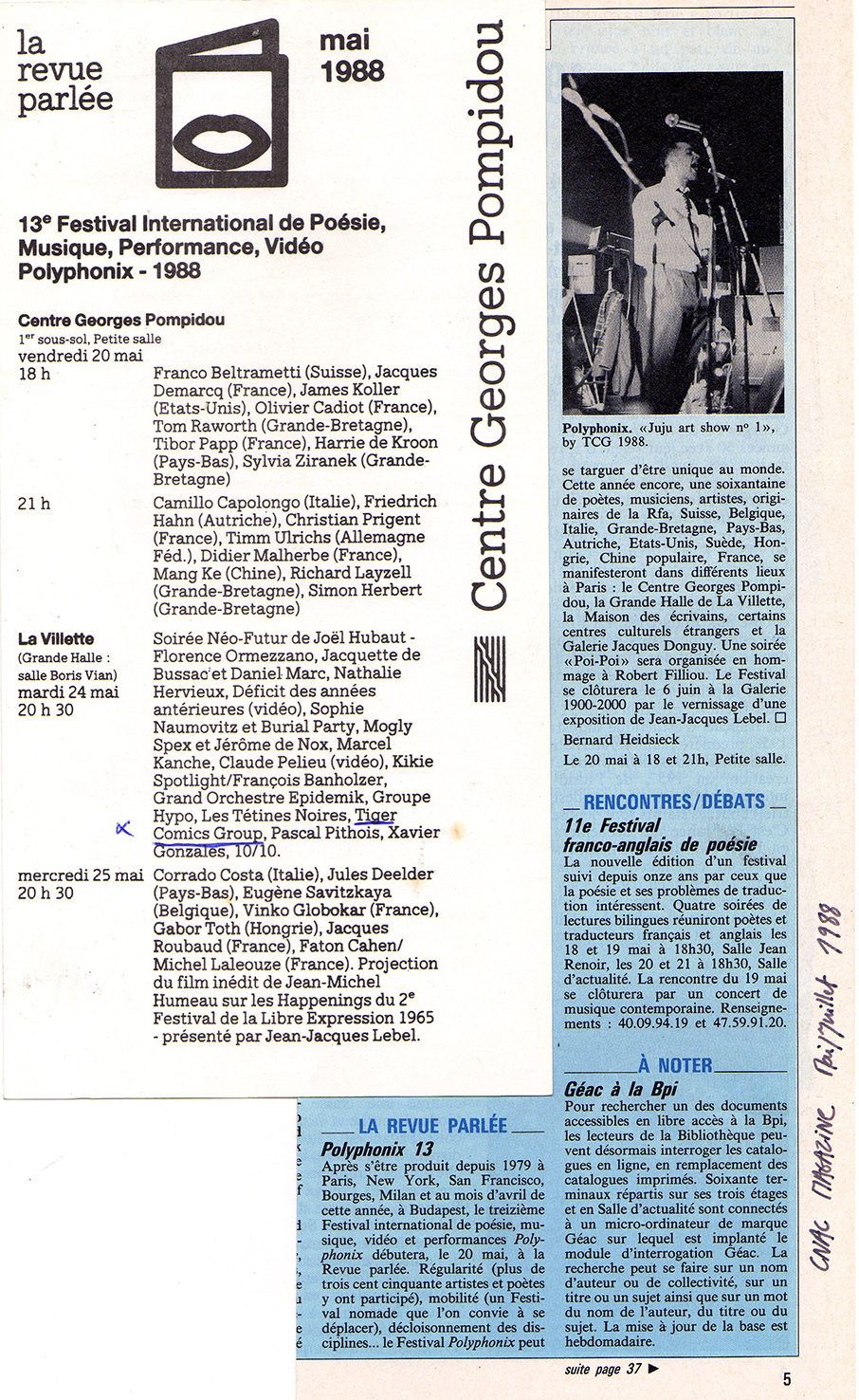 Live Gestations Date: 24/05/1988Author: nickst 0 Commentaires Performance avec projection film Super 8, 13e Festival International de Poésie, Musique, Performance, Vidéo – Polyphonix, 24 mai 1988, Centre Georges Pompidou – Grande Halle de la Villette, Salle Boris Vian, Paris. Partager : Cliquer pour envoyer un lien par e-mail à un ami(ouvre dans une nouvelle fenêtre) E-mail Cliquer pour imprimer(ouvre dans une nouvelle fenêtre) Imprimer Cliquez pour partager sur Facebook(ouvre dans une nouvelle fenêtre) Facebook Cliquer pour partager sur X(ouvre dans une nouvelle fenêtre) X