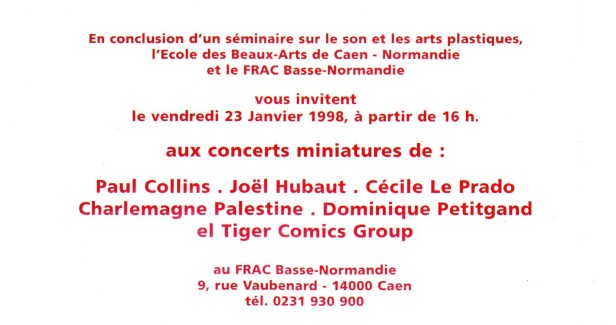 Live Numbers – Frac Basse-Normandie Date: 23/01/1998Author: nickst 0 Commentaires Numbers, live du TCG en conclusion d’un séminaire sur le son et les arts plastiques, avec Paul Collins, Joël Hubaut, Cécile Le Prado, Charlemagne Palestine, Dominique Petitgand. FRAC Basse-Normandie, Caen, 23 janvier 1998. Partager : Cliquer pour envoyer un lien par e-mail à un ami(ouvre dans une nouvelle fenêtre) E-mail Cliquer pour imprimer(ouvre dans une nouvelle fenêtre) Imprimer Cliquez pour partager sur Facebook(ouvre dans une nouvelle fenêtre) Facebook Cliquer pour partager sur X(ouvre dans une nouvelle fenêtre) X